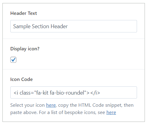 - pasting the relevant code from Font Awesome will load in the relevant icon. Icons will always appear in BSB Orange.